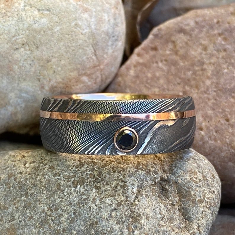 Damasko plieno žiedas su jūsų pasirinktu inkrustacijos tipu: 14K – 585 prabos auksas, sidabras 925, žalvaris arba varis. Žiedas juodintas rūgštimi, kuri pabrėžia žiedo formas ir raižinius.