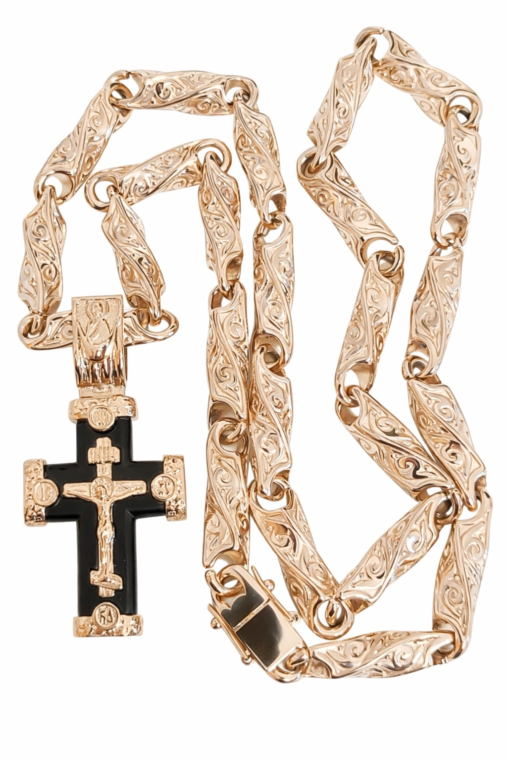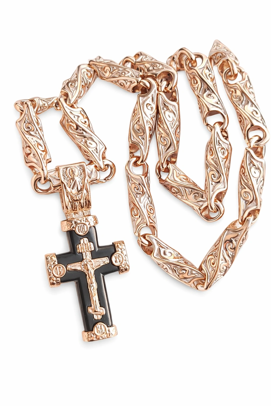 Grandinėlė ir kryželis pagaminti iš titano ir padengti 585 prabos raudonu auksu, naudojant 5 mikronų storio auksavimo sluoksnį. Toks storas dengimas juvelyrikoje vadinamas Vermeil – tai ženkliai patvaresnė ir ilgaamžiškesnė alternatyva įprastam auksavimui.
