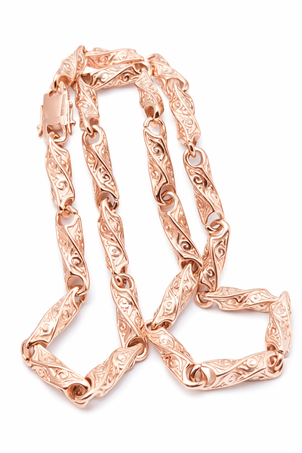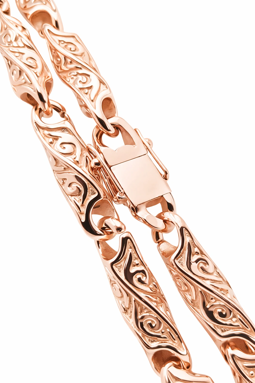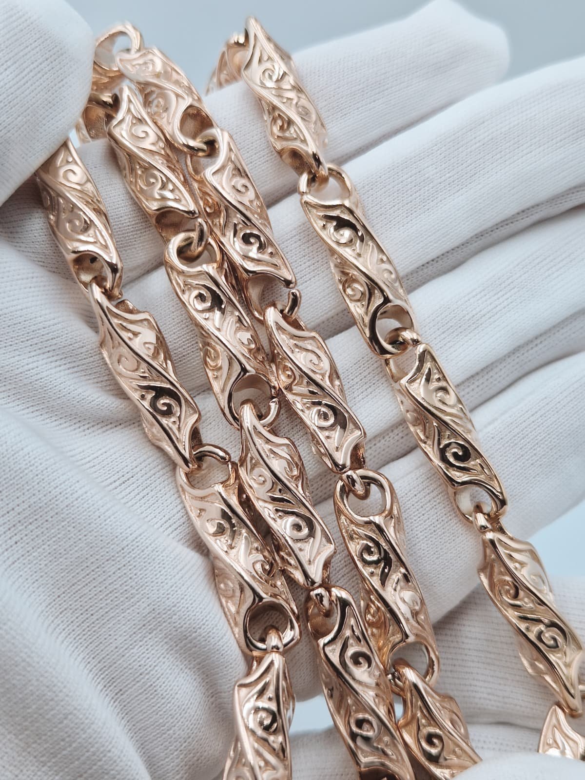 Grandinėlė pagaminta iš aukštos kokybės titano ir padengta 585 prabos rausvu auksu. Naudojamas 5 mikronų storio auksavimo sluoksnis, kuris užtikrina ilgaamžiškumąir spalvą, vizualiai identišką pilnai rausvam auksui.