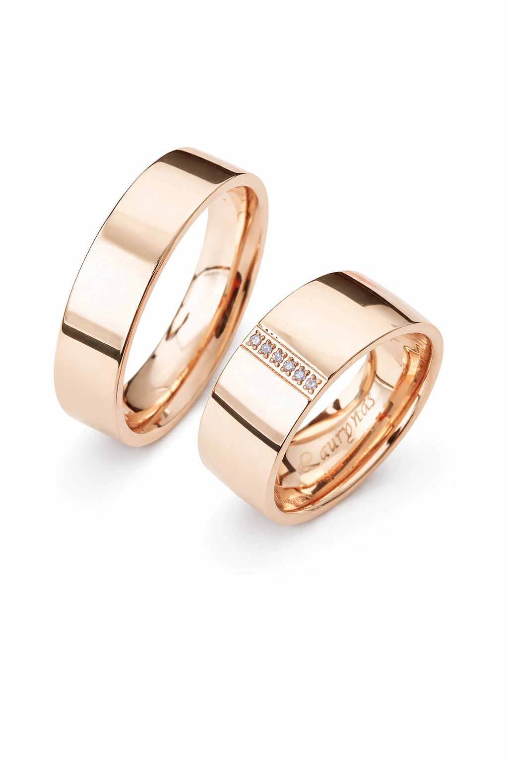 Žiedų išorė spindinti: viršutinė ir apatinė dalys – rausvo aukso spalvos, suteikia žiedams šilumos ir žavesio, o moteriškame žiede subtiliai įkomponuoti cirkonio dioksido akmenys, primenantys deimantus.