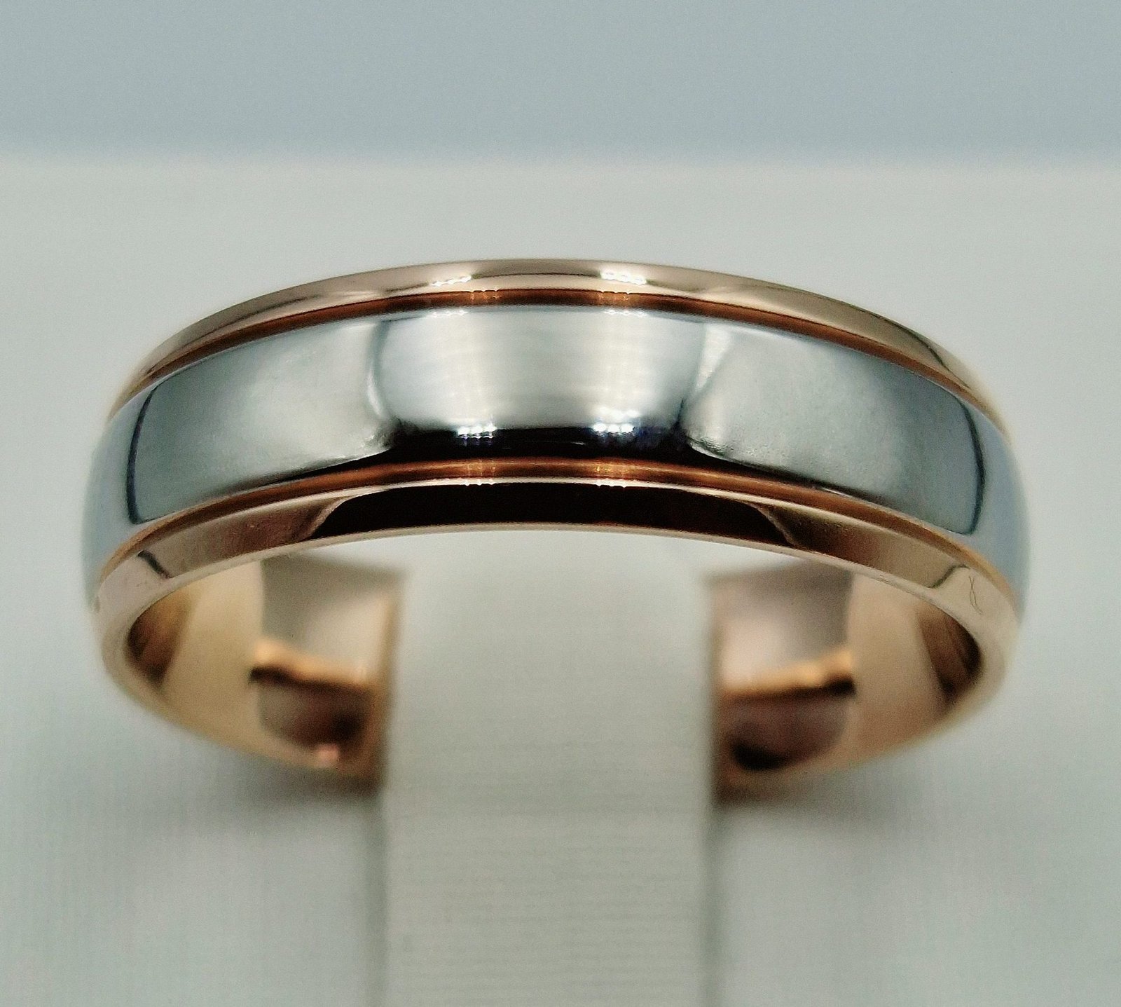 Žiedo vidurinė dalis palikta natūralaus titano spalvos (sidabro tonas), o šonai dengti raudonu 585 prabos auksu, suteikdami žiedui šiltą ir subtilų prabangos akcentą.
