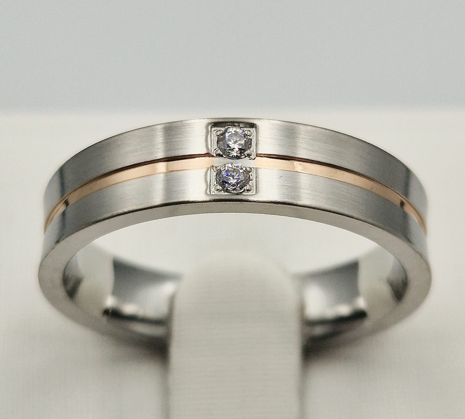 Žiedo dizainas subtiliai derina balta matinę titano spalvą su rausvo aukso juostele, suteikdamas žiedui šiltą, prabangų akcentą.