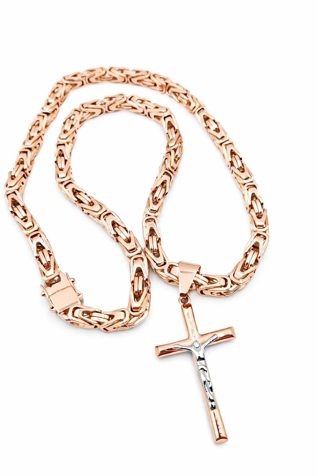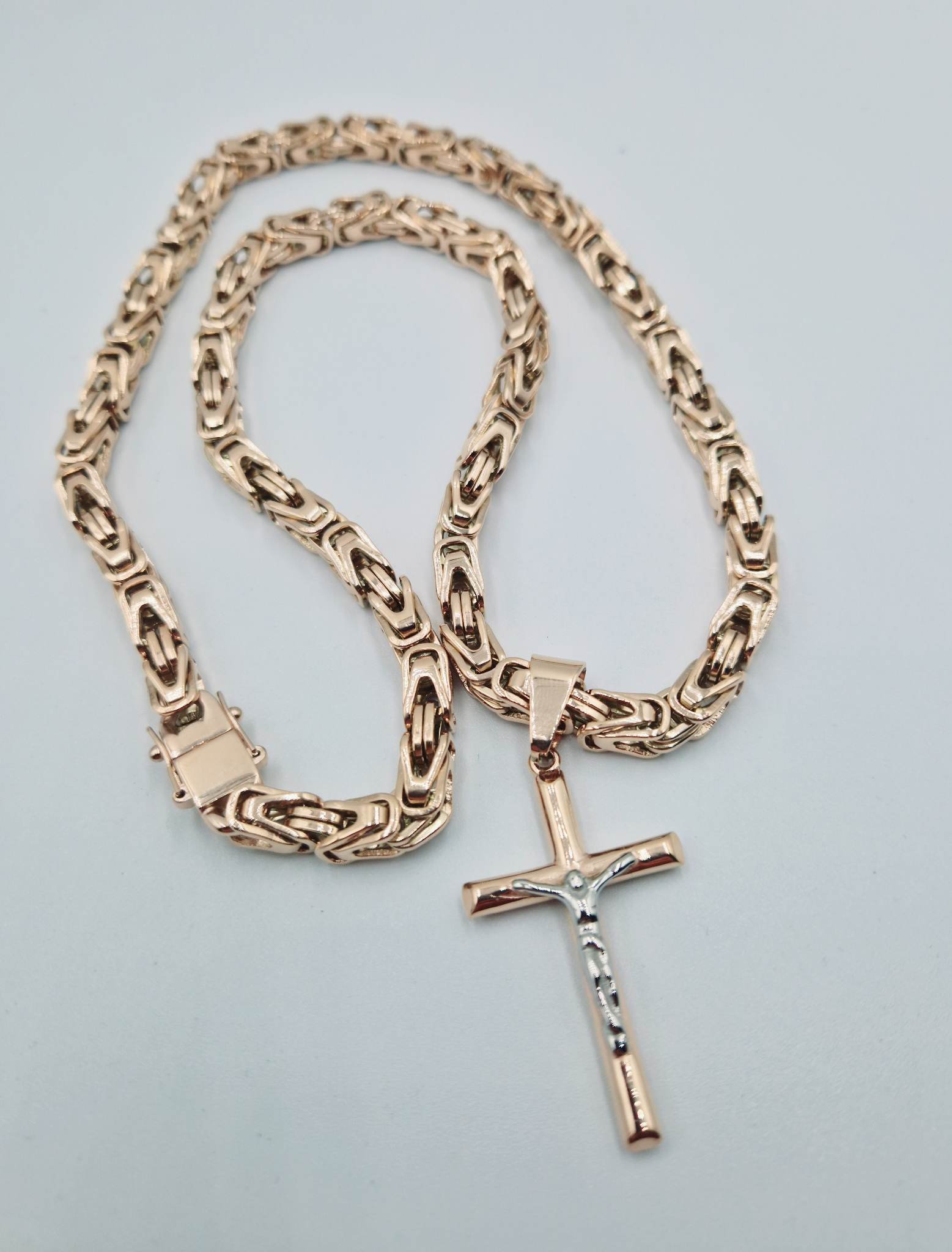 Grandinėlė ir kryželis pagaminti iš aukštos kokybės titano, o jų išorė auksuota 585 prabos rausvu auksu, naudojant 5 mikronų storio auksavimo sluoksnį. Atnaujinta auksavimo sistema leidžia ilgai išlaikyti aukso spalvą ir atsparumą dėvėjimuisi.