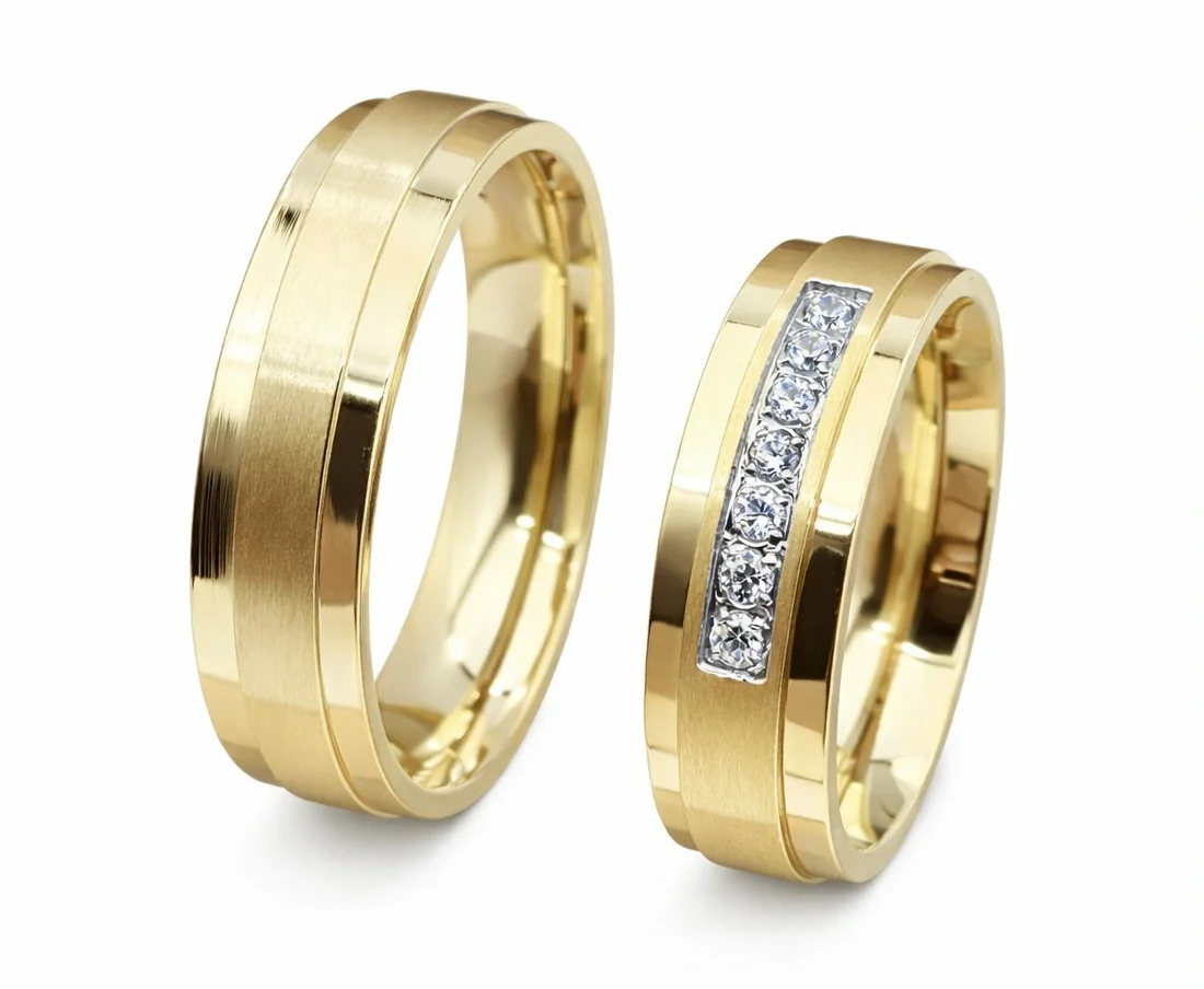 „Santorini Gold“ – vestuvinių žiedų komplektas iš aukštos kokybės titano, sukurtas tiems, kurie vertina šilumą, estetiką ir laikui nepavaldų grožį.